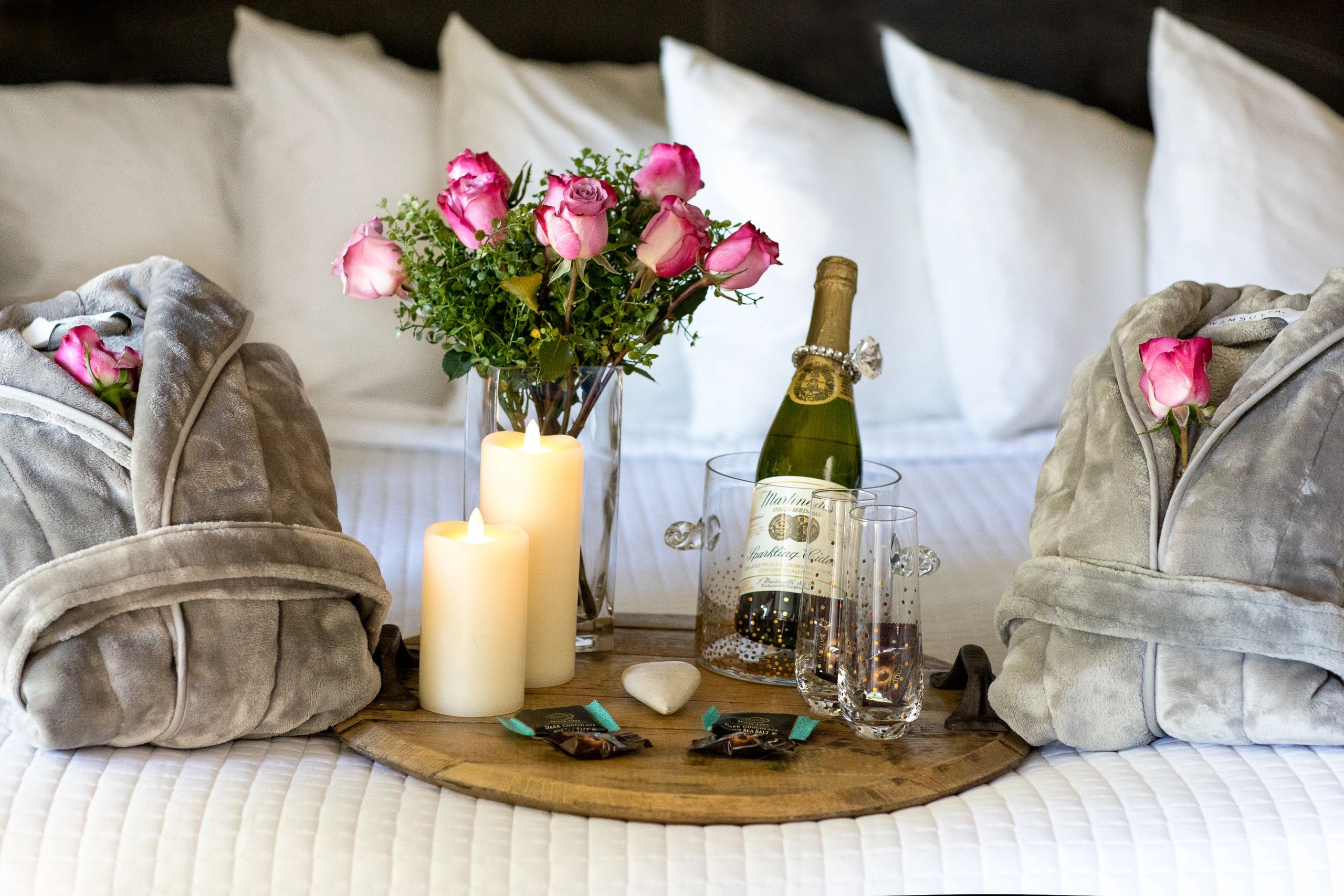 Romantic and fun, our Celebration Packages include a bouquet of seasonal flowers, a bottle of bubbly beverage with two toasting flutes, tasty chocolates for two, flameless candles for night-time ambiance and two fluffy robes to use during your stay!
